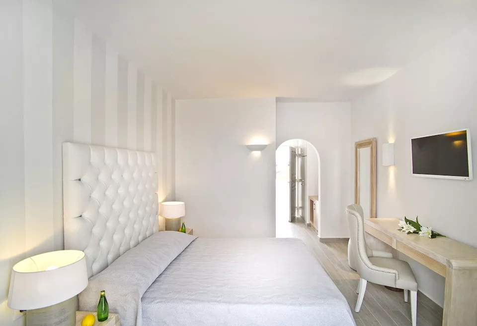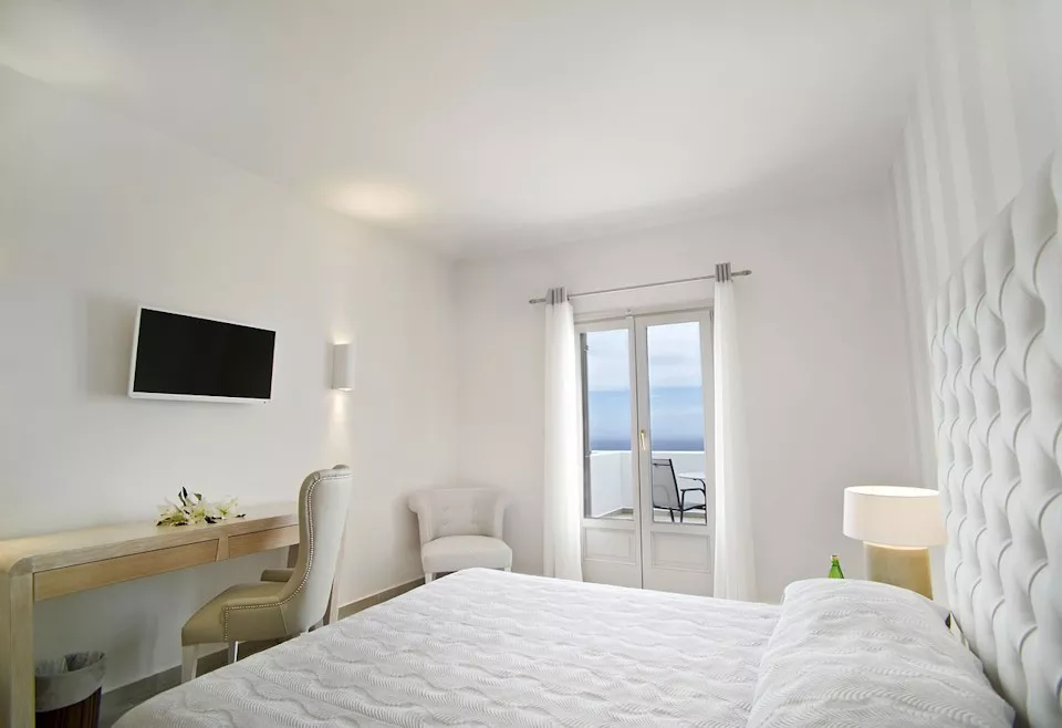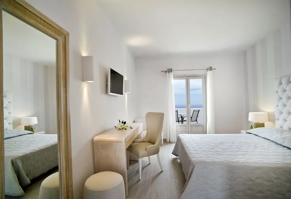 One double bed or two twin beds with air-conditioning (heat & cold), mini fridge, direct dial telephone, satellite-TV (No Greek channels available), private safety deposit box, hairdryer, bathtub or shower, balcony with view to the pool or the eastern part of the island.