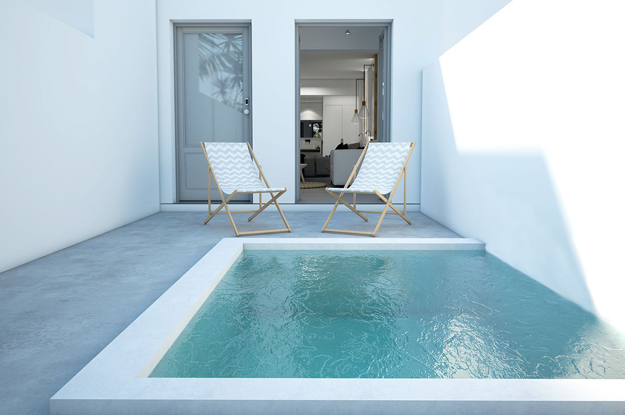 One plan room with private pool, one double bed with air-conditioning (heat & cold), livin